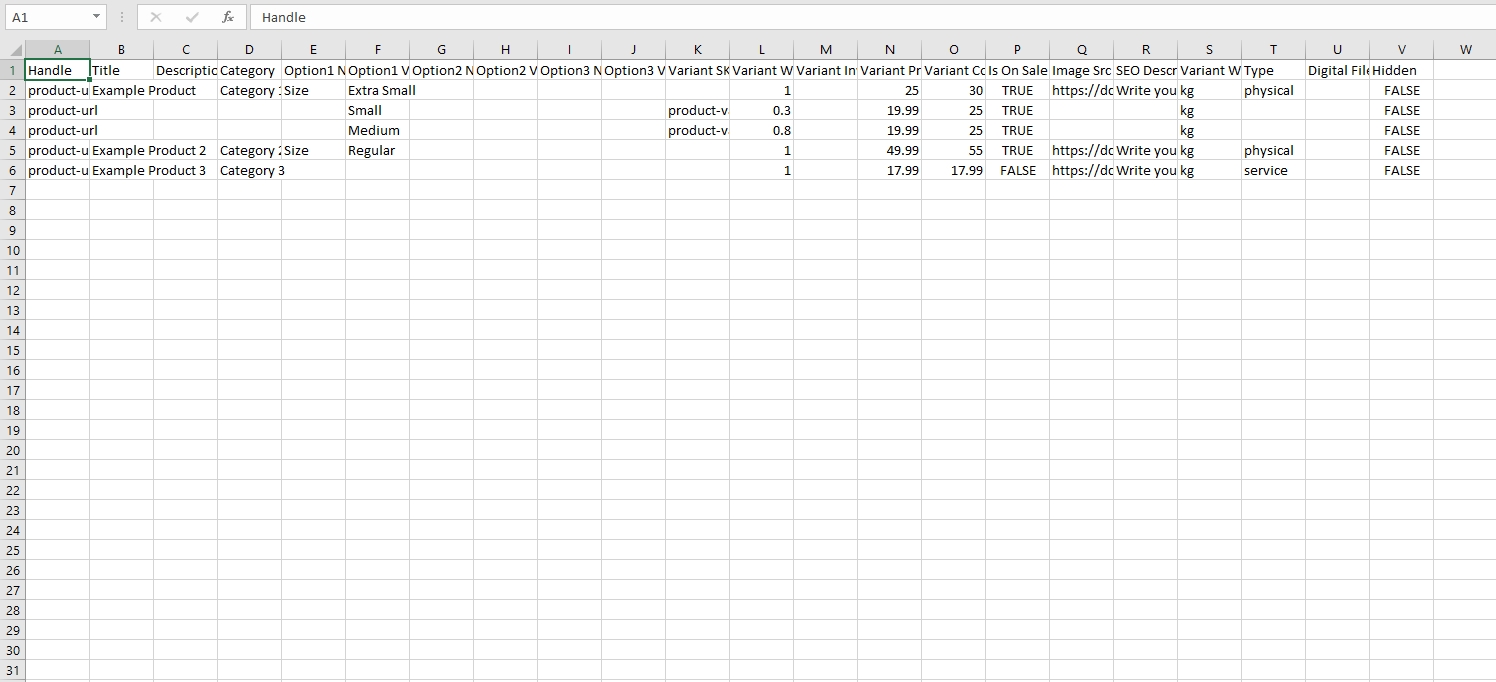 You can view and download an inventory CSV example for reference. It looks similar to the image below: You will be presented with a pop-down menu to merge your existing parameters to start adding items to your store automatically.